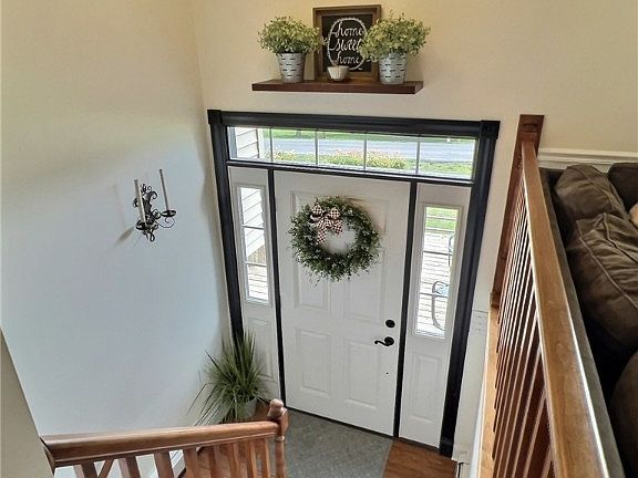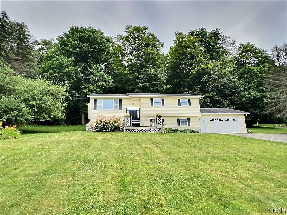 Welcome to this gorgeous 4 bedroom 2 bath raised ranch style home situated on just under 2 acres with stunning panoramic views of the rolling hills and valleys. You'll stop and take the view in from the front porch that leads you to the door and into the foyer. From the foyer, you enter into the open floor plan that includes a spacious living room with picture window and gas fireplace. Adjacent is the formal dining area with sliding glass door out to the back deck, equipped with a canopy covered pergola, perfect for entertaining. The dining room leads into the kitchen that features beautiful quartz countertops, a breakfast bar, updated appliances, and a carefully designed pantry. The hallway leads to the updated bathroom and 3 bedrooms on the 1st floor. Down the stairs, you'll find a lower-level family room with natural woodwork built-ins. The French doors separate the family room from the office area and entrance into the laundry room that couples as additional storage and has a large utility sink. The final room on this level is the primary suite with bath. This suite features double closets, a sitting area, and a gorgeous bath. All offers will be reviewed Tues. 7/23 @ 12:00PM