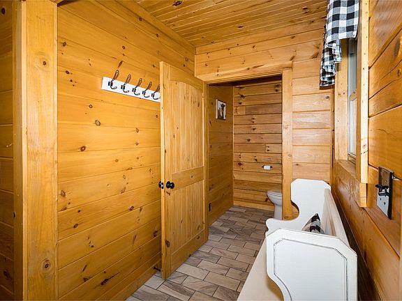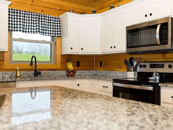 Log cabinSpacious back patioAmple cabinet storageStainless steel appliancesCovered front porchGranite countertops
