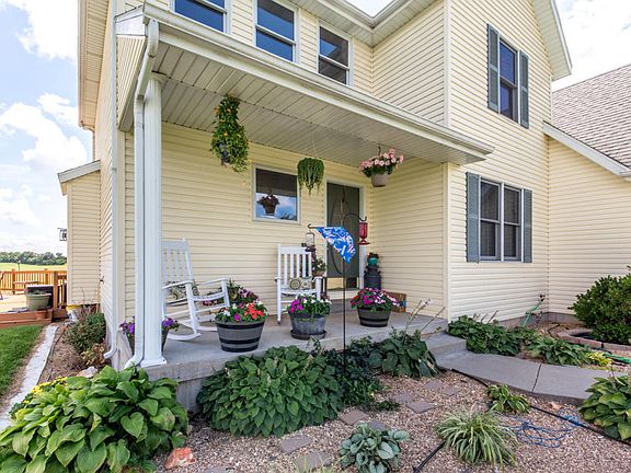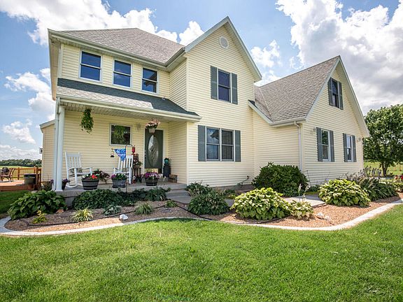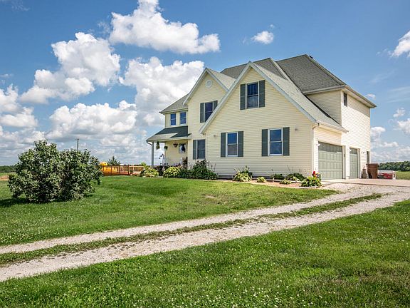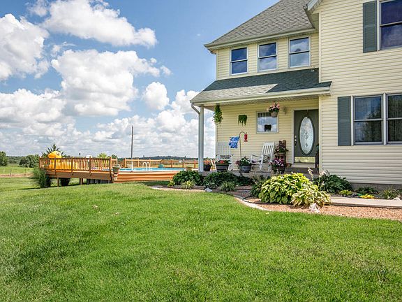 This enchanting 4 bed/2.5 bath/3 garage home with walkout basement is nestled on 6.5 stunning acres with country charm! Landscaping & covered front porch lead to the front door & into the entry way that walks into the formal dining room w/ beautiful hardwoods. Highlights of the sun-filled living room include soaring ceiling, striking floors, cozy fireplace, and vast windows for natural light & views. Opening directly off the living room is the spacious kitchen featuring broad cabinets, expansive counters, plus a large island/bar w/ extra seating. The relaxing master bed/bath boasts architectural ceiling, his & her sinks, jetted tub, walk-in shower, & walk-in closet. Each of the comfortable bedrooms has ample closet space, perfect for the kids. Head down to the walkout basement! The basement offers a sizable 2nd living area, storm shelter, and storage area. Lastly, step outside to outdoor living at its finest! A large deck surrounds the above-ground pool, ideal for entertaining and relaxing. Enjoy panoramic views of the gorgeous, private property! Make this captivating gem your family's new dream home today!