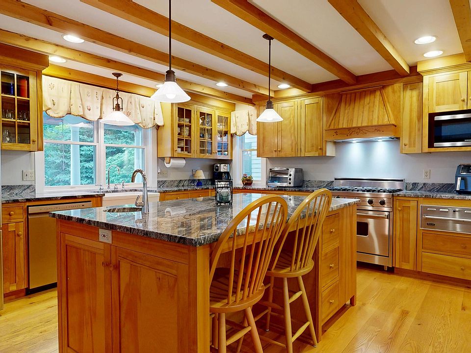 Large barnAttached two-car garageLarge pantryViews of mt washingtonWelcoming back porchBuilt-in bookcases and cabinetsWell-maintained grounds with pond