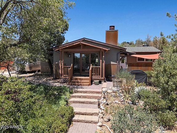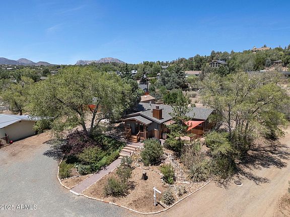 Absolutely charming and thoughtfully updated, this 3-bedroom, 2-bath home sits on a full acre in the heart of Prescott—offering the perfect blend of in-town convenience and country comfort. Inside, you'll find an inviting living room featuring a wood-burning stove, a lit coffered and beamed ceiling, and a custom artisan barn door concealing a clever storage nook. Glass doorway leads to a private patio, ideal for BBQs or relaxing while enjoying the peaceful surroundings. The open kitchen connects seamlessly to the living and dining areas and features newer stainless steel appliances including a gas range, refrigerator, and dishwasher. Both bathrooms have been tastefully updated, including a newly renovated primary suite with upgraded flooring and a modern walk-in shower MORE and plenty of closet space. Primary suite also has access to side patio. Step outside and enjoy lush front and backyard landscaping with irrigation, fruit trees (peach, nectarine, pluot, and dwarf apple), raised garden beds, and a fully fenced backyard. The 12x20 finished shed with tongue-and-groove ceiling makes a perfect art studio, workshop, or flex space. There's ample parking and room to add a garage or guest house. No HOA, and just minutes to downtown, shopping, and schoolsthis is a rare in-town gem with space, style, and comfort. Recent improvements throughout the home include: newer roof, windows, flooring, upgraded electrical (including a subpanel for a future hot tub), newer water heater, and added insulation for energy efficiency. HVAC system was inspected and serviced in 2025.