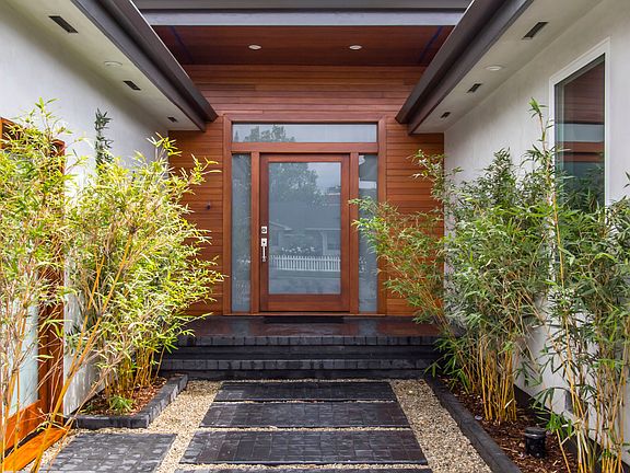 wide hallways and smooth flowing layout. The grand cantilevered entry greets you with wood and frosted glass via stamped concrete paver path. Inside high ceilings, soffit lights and clean lines continue the contemporary theme. Both the architectural aficionado as well as the ecologically concerned will appreciate the attention to detail. A cook’s kitchen with custom bamboo cabinetry, Frigidaire Pro stainless steel appliances, glass tile backsplash and granite counters. Generous storage opens to the family room with a wall of doors and see-through double sided fireplace. A large usable yard features an outdoor fireplace and outside kitchen with built-in BBQ. The home has Acacia wood floors, travertine tile and natural slate and granite. All LED or low-voltage lighting as well as skylights, and high ceilings for an airy open feeling. There is a whole-house URC Total Control entertainment system with numerous smart home automation possibilities. On the green side is a state-of-the-art solar array, 5-zone 2-system 13-seer HVAC with 5 remotely programmable thermostats, and a central vacuum system. And for those desiring comfort the master suite does not disappoint with a large organized walk-in closet, a fireplace and separate sitting area. The master bath is sumptuous with a rainfall shower, large 7-foot vanity, great storage, and a decadent soaking tub. The landscaping has artificial turf, drought-sensitive plantings and efficient drip irrigation system. All within the desirable Fashion Square neighborhood.