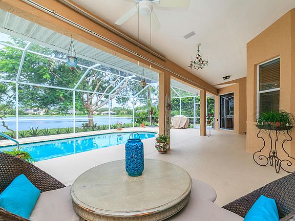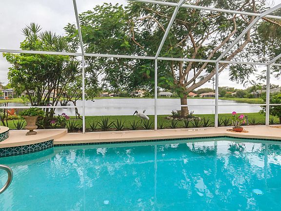 BREATHTAKING LAKE VIEW! Open the door and be greeted to one of the best views in Three Oaks. Incredible 3 bedrooms 2 bath home takes advantage of a fantastic view over the pool to the lake. Enjoy watching a sanctuary of visiting birds and turtles throughout the tropical landscape. Pick mangos, peaches, figs, lemons, and avocados from the trees surrounding the property. This open floor plan puts the outside at center stage. Sliding glass doors open up fully uniting the living room with the screened lanai. Well maintained, owners added tile floors throughout, hurricane shutters, granite countertops in the kitchen, central vacuum for easy and quick cleaning, and a new (2016) pool pump for the solar heated pool. There is also an in-ground propane tank for outdoor grilling - great for entertaining in our Florida weather! You will be impressed with the view JUST ENTERING THE FRONT DOOR - come see! Enjoy more views in our virtual tour video.