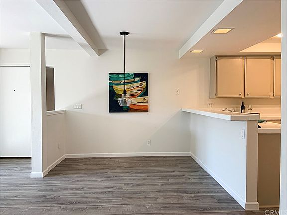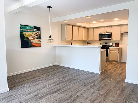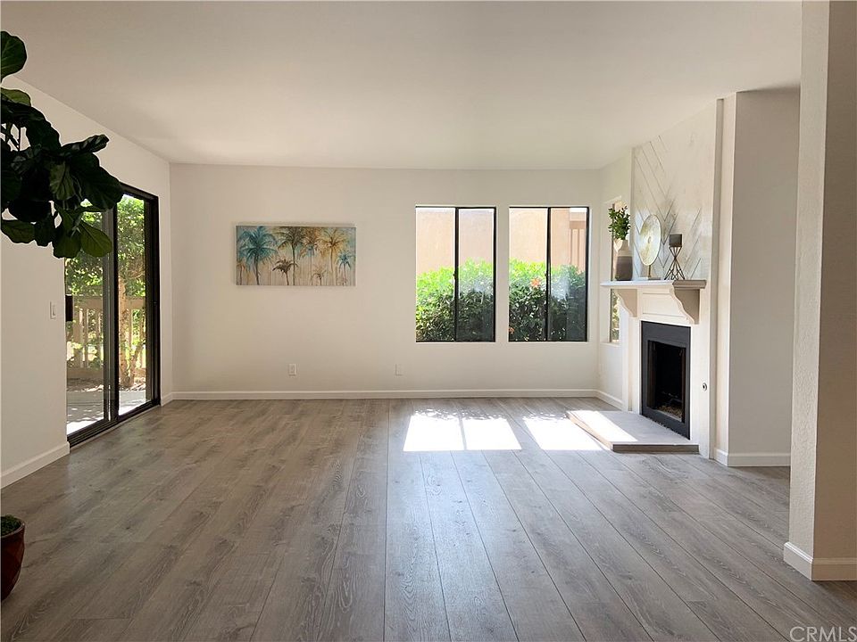 Unquestionably one of the most spectacular Harbour Vista homes. This exquisite 1 bed, 1 bath home has $20k worth of upgrades & offers over 840 sqft perfectly situated in a quiet interior location. This property offers one of the most desired locations, is an end unit, single story living situated on the first floor. This unit shows impeccably and offers a very open feel. From the moment you walk through your front door, you will be transformed by the extensive upgrades, featuring a very large kitchen/dining room space w/ freshly painted kitchen cabinets, re-glazed white tile counters, double sink, recessed lighting & new stainless steel appliances. The living room is generous in size w/ a gas burning fireplace, tons of natural light from the over-sized windows & sliding glass door leading out to your private patio. The entire house has been elegantly lined in wide plank style flooring. Enter your master suite through a set of French doors which offers a spacious walk-in closet, mirrored wardrobe and a master bath which boasts new custom vanity w/soft closing drawers & oval style soaking tub/shower combo, new toilet and patio access. Add. features; new designer paint, new heater, full size W/D laundry room, 1 car detached garage plus 1 add. parking spot directly outside your home. Harbour Vista is a gated community located approx 1 mile to the beach and harbor. Community offers greenbelts, calming streams flowing throughout, a beautiful pool and spa, as well as a clubhouse.