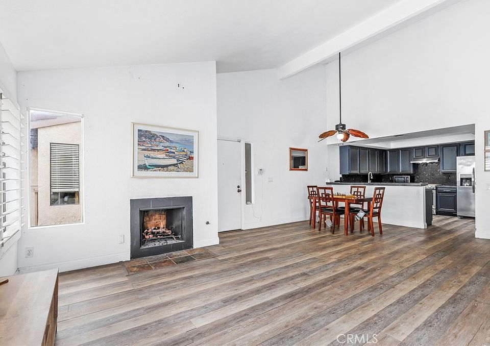 Enter into your spacious living room with soaring ceilings, a gas fireplace, plantation shutters, and sliding doors that lead to your own private patio. Natural light flows through the open floor plan.