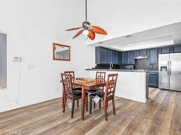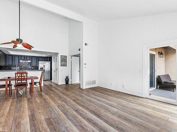 The kitchen includes stainless steel appliances, and breakfast bar overlooks the dining room with ceiling fan. Home boasts private laundry room with ample storage space . The primary suite features vaulted ceilings with fan, an en suite bathroom with vanity area, shower and soaking tub and a spacious walk in closet. There is also a slider for direct access to the private patio.