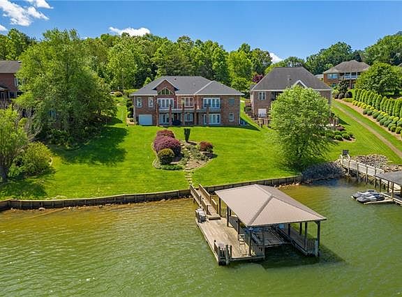 Enjoy panoramic views of Lake Hickory's main channel from this one-level home with finished basement in Lake Shore! The main level offers an inviting covered front entrance leading into a central foyer opening onto a private home office with gas fireplace and formal dining room. The great room offers a vaulted ceiling, wet bar, & wall of windows overlooking the water. The adjoining kitchen has a center island, granite countertops, gas cooktop, double ovens, & breakfast area with views of the lake. The split bedroom plan offers a private master suite with doors to the rear deck, & master bath with walk-in closet, double vanity, and Roman shower with two shower heads. The 2nd and 3rd bedrooms are located on the opposite side of the house and share a Jack & Jill bath. The full lower level offers a spacious rec room with kitchenette, exercise room, laundry, 2nd master suite, and workshop with garage door. The gently sloping yard leads to 126' of water frontage with covered dock and lift.