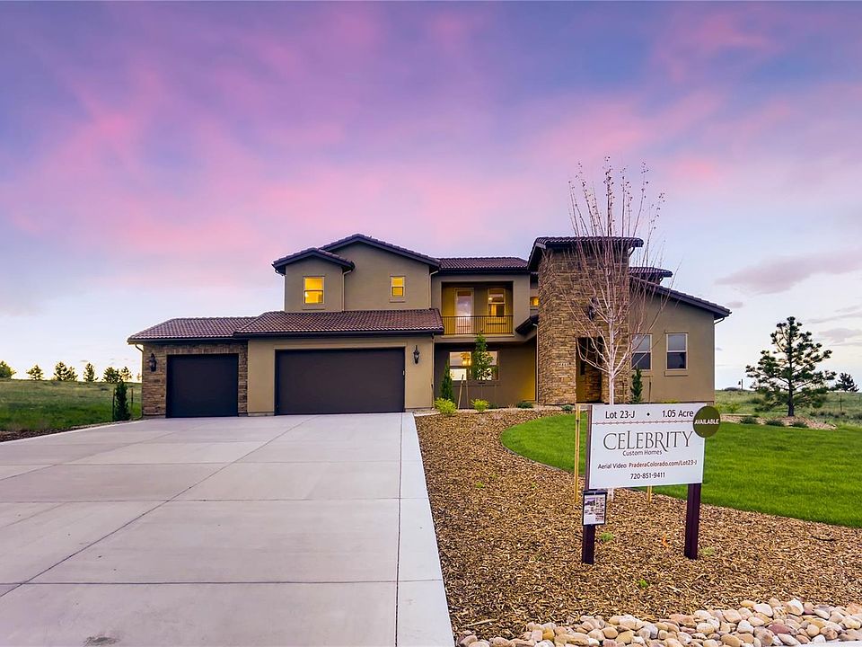 This highly-livable 2-story family home sits on a large acre+ homesite with golf course vistas. The exterior of the home features professionally-designed front and rear yard landscaping, extensive stucco and stone, and a dramatic entry loggia. The main level offers hickory hardwood flooring, a secluded study, formal dining and an open kitchen/great room/nook layout. The spacious gourmet kitchen includes stainless appliances, quartz countertops, a large island, walk-in pantry, and open views to the great room with fireplace. The nook provides informal dining space & access to the covered rear outdoor room. The upper level includes a large loft, conveniently located laundry room w/sink, 2 secondary beds, a secondary bath, and a master suite with spa-like bath including a corner soaking tub, separate shower, his-and-her vanities & walk-in closets. The finished basement features a large rec room with wet bar with refrigerator, a 4th bed, full bath & an unfinished storage area.