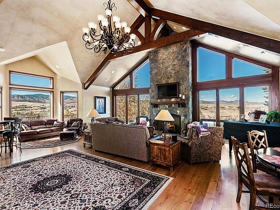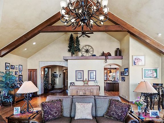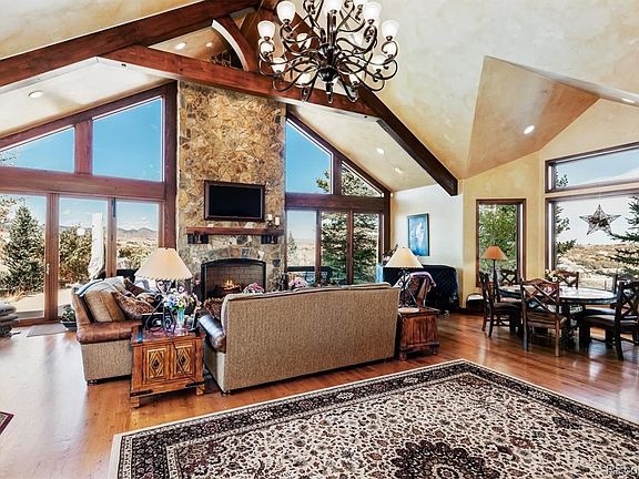 Custom Home with spectacular Front Range Mountain Views on 10.59 acres! High-end features throughout including custom woodwork. Oversized Great room with a stone fireplace, multiple seating areas, and Entertainment doors out to the open patio with an outdoor fireplace. Inground swimspa with views of the mountains and nighttime stars. Backs up to hundreds of acres of open space providing unmatched privacy and access to walking and horse trails. Gourmet kitchen with slab granite, double ovens, a built in wine rack, two Bosch Dishwashers, Large Dacor cooktop, and stainless appliances. Grand Dining Room with its own fireplace and access to the 80 foot, no maintenance, new composite wrap around deck. Main floor Office plus a second office and Main Floor Laundry Room. 4 bedrooms upstairs plus a NANNY SUITE / Mother-in-Law Suite with its own bedroom and bath above the garage. The NEWLY finished walkout basement includes a stone fireplace, a gaming area, & full bathroom. Over 6900 Finished Square Feet PLUS an additional 1000 square feet of storage area. There is also a storage shed and a chicken coop with 3 egg laying chickens (included). The property allows for up to 4 horses. Level backyard for all kinds of recreation. Conduit has been installed throughout the basement and main floor to accommodate future upgrades to data, audio and video wiring. Surround sound in the Basement & Great Room. High Speed WiFi is available. Gental sloping grass fields leads down to the open space and tubing hill! Low taxes and low HOA. Conveniently located just 12 minutes to I25, Starbucks, Whole Foods, Castle View High School & the Outlet mall. 5 minutes to Santa Fe, the Post Office & the fun restaurants in Sedalia. Mature trees and garden beds surround the home and are watered with digitally controlled irrigation system. Level area off driveway is ready for a secondary out building.