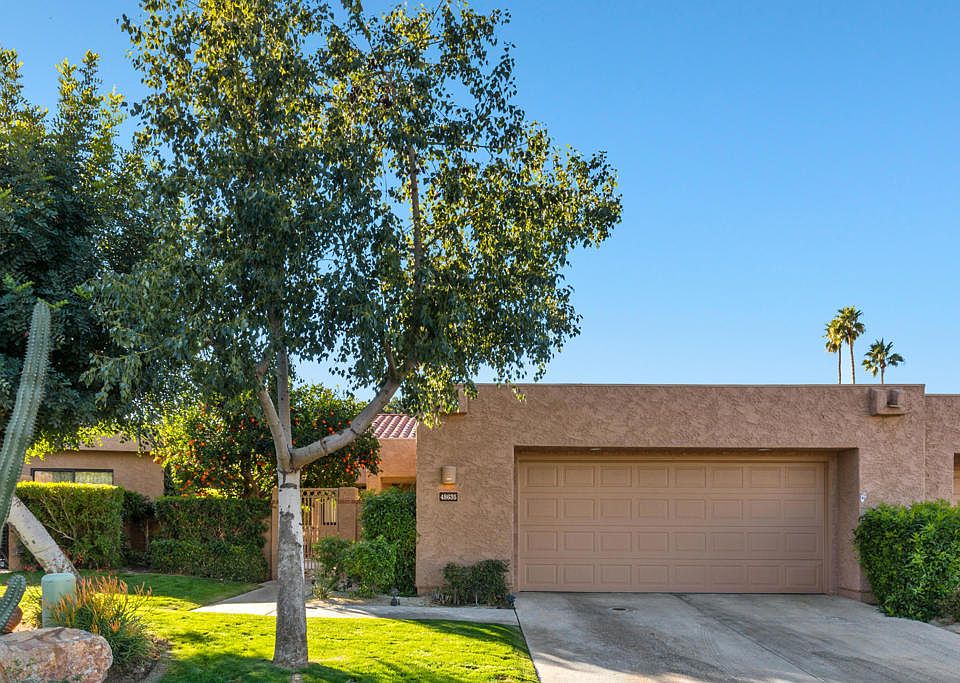 Stunning 3-bedroom Ironwood Country Club Condo. This home has undergone an extensive and tasteful remodel, showcasing modern Luxury and thoughtful, Energy Efficient upgrades. Tankless Hot Water Heater, Whole Home Water Filtration System, Owned Solar, New Windows, and HVAC.Flooded with natural light, this home features Porcelain Tile Flooring, Quartz Countertops and a Stone Fireplace.The Kitchen is a Chef's Dream, reflecting a perfect blend of style and functionality, featuring a SubZero refrigerator and Wolf range.The 3rd bedroom is currently configured as a versatile den, providing flexibility to suit your lifestyle. It could effortlessly be transformed, adapting the space to meet your specific needs.The 2-car garage has been meticulously finished, offering both functionality and aesthetic appeal and a EV charger. Situated on a green belt with mature fruit trees and peek-a-boo Mountain Views, the outdoor space is a peaceful retreat, perfect for Relaxation and Entertainment. Just a few steps away, making it incredibly convenient for leisurely swims, you will enjoy the refreshing community pool.This condo in Ironwood Country Club epitomizes Modern Elegance and Thoughtful Design, offering a unique opportunity to experience Luxurious Living in a Prime Location. Don't miss the chance to make this exceptional property your new Desert Retreat.