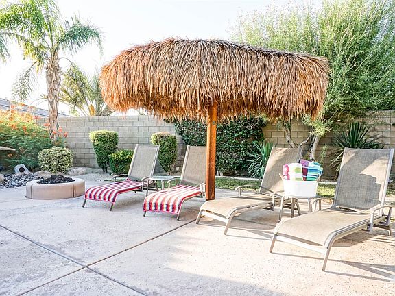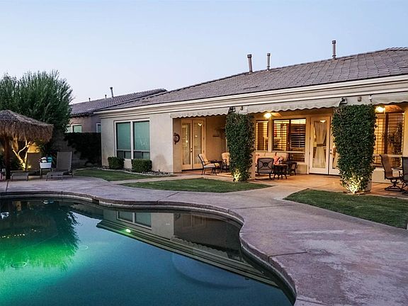 Entertainer's delight! This stunning home offers an oversized backyard w/ large pool & raised spa & waterfall feature. This backyard is sure to welcome your friends & family w/ two Tiki huts, fire pit, Tiki torches, pool foggers, retractable awnings & misters system. With plenty of covered patio you have room to lounge outside and dine while the sun sets over the majestic Santa Rosa Mountains. Inside you will love the open floor plan w/ the great room equipped w/ surround sound & open to the kitchen & morning room w/ plantation shutters. Enjoy the formal dining room or use it as a media room. The master wing offers nice seperation from the other two bedrooms. The den is currently used as a 4th bedroom with sleeper sofa and flatscreen TV. This fantastic home is close to shopping and dining. With endless possibilities and within walking distance to the world reknown Coachella & Stagecoach Festivals this home can become your dream home, vacation home or an amazing investment opportunity!