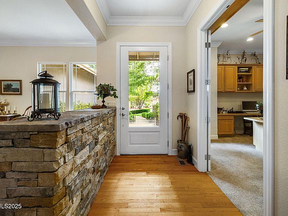 From the moment you walk in you can feel the pride of ownership. Located behind the gates of Mountainshyre in the sought-after neighborhood of Caughlin Ranch, this beautiful single-story home offers an ideal layout with the primary suite thoughtfully separated from the remaining bedrooms. Featuring 4 bedrooms plus an office, 2.5 baths, and 3 car garage the home is designed for both comfort and functionality. The kitchen is a chef's dream with double ovens, multiple sinks, a butler's pantry, ample prep space, breakfast nook, and breakfast bar. The laundry room doubles as a mudroom and includes its own sink for added convenience. Additional features include wood floors, crown molding throughout, central vacuum, a new hot water heater, and a spacious primary suite with a huge walk-in closet. Step outside to discover a private garden oasis - immaculately maintained with lush landscaping, a large patio, and grass. The backyard is fully fenced, stubbed for a gas BBQ, and perfect for peaceful relaxation or entertaining. Enjoy scenic walking trails right in the neighborhood, and take advantage of the home's central location, just minutes from the Reno-Tahoe Airport, shopping, dining, and more.