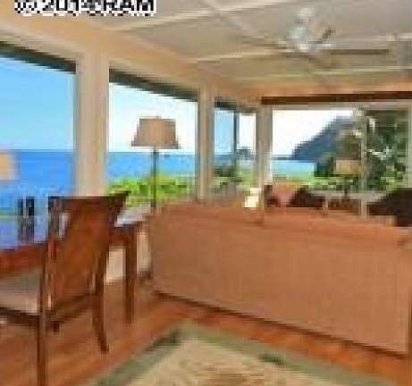 What an amazing opportunity to own 50% ownership in this beautiful oceanfront unit in Hana. Enjoy the expansive views and the sounds of the East Maui seashore. Unit 5 is the premiere unit in the complex. Renovated with thoughtful design and tasteful finishes. Two bedrooms two full baths with two large lanais. The additional living space of the lanai's make this the place to be for any hour of the day. It is a top floor deluxe unit with a king bed in master bedroom and a queen bed in the 2nd bedroom. Beautiful kitchen and two baths with porcelain tile floors, granite countertops, bamboo cabinetry. The living room and bedrooms have hardwood floors, expanded windows for a panoramic view of the ocean to the east and koi ponds to the south. If you have ever been to Hana this is the place to stay. The complex has 19 units and this is the only 2 bedroom unit. Unit is in onsite rental program fully furnished. Monthly Maintenance fee includes electricity.