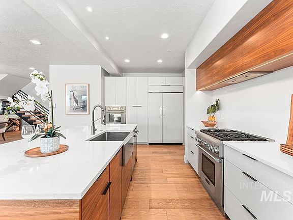 A stunning modern retreat in Hackberry North, offering refined craftsmanship & luxury living in Boise’s premier Highlands neighborhood above the North End. Custom designed & built for builder's own residence with clean Scandinavian-inspired design & designer finishes. Walls of windows with tint & special glass fill the home with light while offering privacy & protection. Wide-plank wood floors flow through the open-concept great room with a striking asymmetrical fireplace. The chef’s kitchen features sleek white & walnut cabinetry, quartz countertops, Thermador gas cook top, two ovens + steam oven, Sub-Zero fridge, and a spacious walk-in pantry. The main-level primary suite is a private escape. The luxurious bath includes heated floors, soaking tub & stunning shower. A main-level dedicated guest suite offers ideal separation. Upstairs, find two more bedrooms, a bonus room & a balcony with peekaboo city views. The 31’ deep RV bay, private heated pool & hot tub complete this exceptional foothills property!