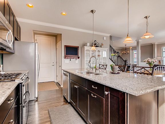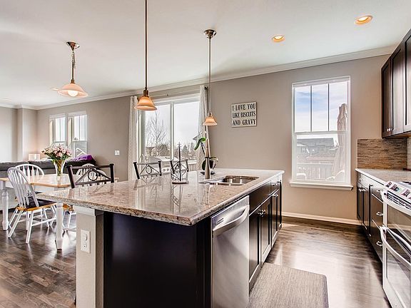 Fantastic Bear Creek Meadows 2-story with a rare fully finished basement! This wonderful home features an open floorplan with a gourmet kitchen, large island perfect for entertaining, beautiful granite counters and tile backsplash, and extensive hardwood flooring throughout main level and upstairs. Other features include a large loft area upstairs, extensive crown molding, a dream master suite with large closet and beautiful 5-piece bath, upstairs laundry and secondary bedrooms. The daylight basement adds an extra family room and a perfect guest suite with attached full bath (and a ton of extra storage). The corner lot and large backyard are amazing, with a deck off the kitchen, plus a huge stone patio and gas firepit, and a large grassy area. This house has it all, including the perfect location with easy highway access to downtown, the mountains or the tech center!