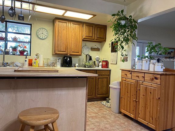 secluded country living but close to grocery store and gas station, many trees, fenced cross fenced, warm and inviting interior, vaulted lr and dining rm, extra lg kitchen both have tile floors , huge master suite with exterior doors and patios, own 350ft well and storage tank with fully automatic watering system, close to lake and river, view of mountains. Solar is being installed soon.