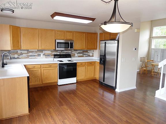What a great value! Fresh white paint in the colorful rooms and work being done on the deck. Not much left to do on this property unless you want to make changes to make it your own! Four bedrooms, 3.5 baths, and walk-out basement in a fabulous neighborhood! 25 minutes from just about everything Colorado Springs has to offer! Walk in to the vaulted living room that flows toward the great room kitchen/dining/family room area. Sliding glass doors open to the deck with stunning views of Cheyenne Mountain. The upstairs boasts a primary bedroom with attached retreat - perfect for an office, nursery, sitting area or work out area. With a 5 pc bath, walk-in closet, and terrific mountain range views - what is not to love? The secondary bedrooms overlook the front yard and have a shared hall bath. The furnace was replaced in Nov 2022 with an upgraded Trane energy efficient furnace. Brand new roof with Class 4 shingles put on April 10th! Major expenses already covered! This home needs a little TLC but has some fixtures refreshed. There is a fully finished walk out basement with an outdoor entrance that has been used as an Airbnb for the last 5 years; it could be a multi-generational living space with a huge bedroom, living and dining area, full bath and kitchenette, an income producing space or just a separate apartment for that additional adult or, college student or teen that needs their own private area. The fenced back yard has an 8 x 10 storage shed, flat usable grass space, and beautiful flower boxes on all sides of the patio. No HOA fees