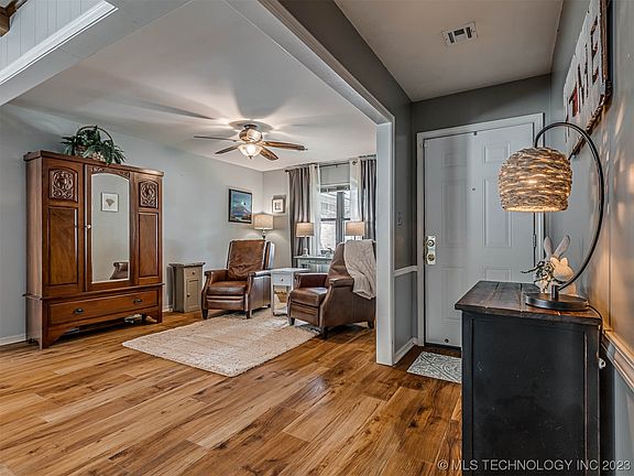 This updated 3 bedroom, 2 bath home is nestled on a quiet street in the heart of Tulsa in an established neighborhood close to parks, shopping and highway access. This home boasts upgraded aluminum Thermal double-hung windows with full screens. This full brick home offers a covered front porch, nice landscaping and inviting trees. The oversized kitchen is open to living with a large attached island between. Laminated wood throughout living and kitchen. The backyard oasis encompasses a tranquil retreat complete with a koi pond, shaded back patio, wooded deck to above ground swimming pool, and an oversized shed/workroom complete with full electric, shelving and wifi controlled attic fan. Backs to a greenbelt. HVAC 2018, Water Heater 2021.