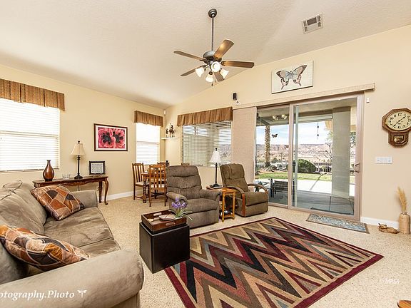 Located in the adult gated community of Highland Hills, this immaculate home boasts three of the most sought after features buyers are looking for in Mesquite: set on the fourth fairway of the Falcon Ridge Golf Course, fabulous mesa and mountain views, and a spacious three car garage. This three bedroom, two and a half bath 1992 SF home has been meticulously maintained by the original owner; newer exterior paint, heat pump, and water softener. This popular floor plan has two ensuite bedrooms, guest bedroom, a large kitchen with lots of cabinets and extensive workspace and breakfast nook, and a laundry room with cabinets, sink, and work area. Covered patio off living room provides fabulous views of golf course and mesas. A great setting in this quiet adult neighborhood. Furniture package available.
