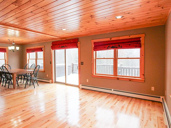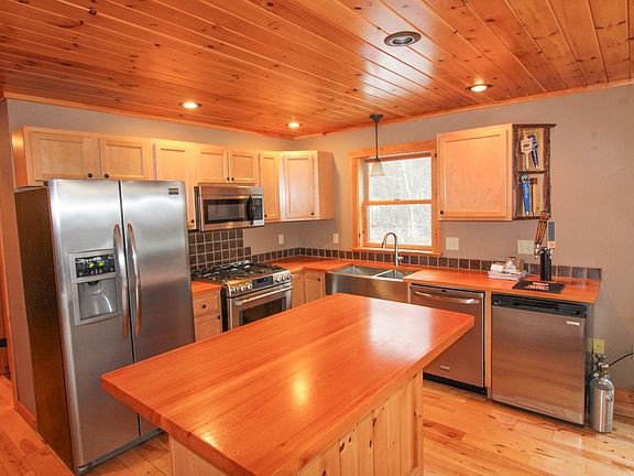Log sided chalet with a custom real wood burning fireplace, 3 levels of usable space, and walking distance to the lodge. At Mt. Abram you get the best of both worlds with skiing and mountain biking just down the road. The property offers a tile mudroom upon the entry with direct access from where you would park. The kitchen is impressive with wood counters, an island, kegerator and matching appliances with a gas range. The dining area is just off the kitchen and living room ideal for entertaining groups and gathering together. On the main level you also get a bedroom with full bath across the hallway. Upstairs you will find 2 large bedrooms both with high ceilings and a shared bath. On the lower level the sellers have left you with a few small finishing touches such as walls and flooring to finish to your liking and generate even more square footage in the calculations. This will make a great 2nd family room, media room, fitness area or just additional storage if not needing right away. The deck off the main living room has a wrap around feature with access from the exterior or inside off the living room and hosts a great location for a hot tub. In the back yard you get to enjoy the firepit with large boulders and a private forest view. There is currently a dog kennel with house in place for your 4 legged friends if wanting to keep. Great rental potential from all seasons at this property for both Mt. Abram, Bethel village and Sunday River.