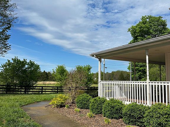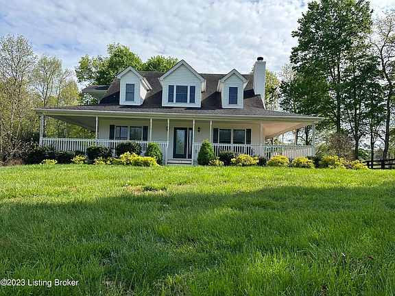 Located approx. 20 min from Glendale, Etown, & Ft Knox, this custom home with completely wrapped covered porch sits on 2.5 acres. Open plan with soaring 18-foot vaulted ceilings in living area. Stunning creek-stone wood-burning fireplace open to kitchen and dining room. Custom kitchen has farmhouse sink, breakfast bar, island, stainless appliances, and corian coutertops. Large walk-in pantry and laundry room (washer and dryer stays with home) off kitchen area equipped with pet wash station. Main floor bedroom and full bath. Master suite has window seat and private balcony with stunning views. Custom shower, soaking tub, and California walk-in closet. Walk-out basement offers a bedroom, full-bath, kitchenette, and playroom/flex space. Newer water heater and HVAC upstairs, Acreage fully fen and also offers underground pet fencing. Outbuilding has wood floors, HVAC, water, and electric. Whole house water softener. Upgraded landscaping and walkways to access basement access.