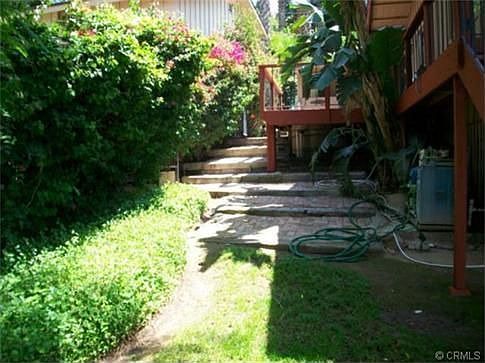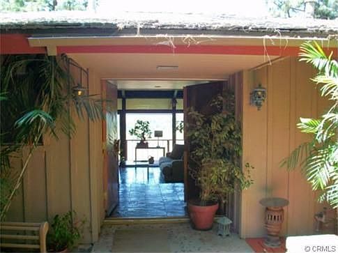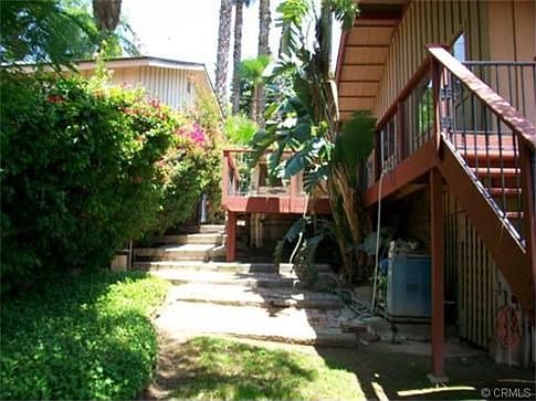 Unique home is tucked at the base of Mt, Rubidoux surrounded by towering trees. Stairs lead from the street to the large double door entry. Opening the doors you see through the living room to the balcony with a view overlooking the riverbottom. Entry, halls, living room, dining area and kitchen have custom slate floors. Custom wood floors in the bedrooms. Lush outdoor foliage can be seen from every room. Indoor sauna as well as an outdoor spa. Enclosed aviary on side deck. Balcony flows across the whole width of the home with access from the master bedroom, dining area, and living room. Home features 3 bedrooms, 2 baths. One bedroom is being used as an office. Separate stairs from balcony to yard below