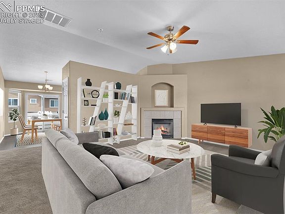 Recently updated, you don't want to miss this penthouse condo tucked away in the Silver Hawk Commons community! Fresh paint, new flooring, and abundant natural light run throughout the welcoming interior. Enjoy a spacious open concept floorplan accented by a soaring vaulted ceiling and a cozy gas-burning fireplace. The kitchen features ample cabinet space, a pantry, and a tile backsplash. The sunny dining space opens out a private balcony is framed by beautiful views of the Rockies and overlooks a serene greenbelt. The private primary suite delights with a sizable bedroom, a walk-in closet, and a bathroom with double sinks. Two additional bedrooms at the end of the hall are generous-sized and share a nearby full bath. As an added bonus, the unit comes with a convenient in-unit laundry closet, two storage units (one rather large and with electricity), and two parking spaces located directly in front of the building. Relish a low-maintenance condo lifestyle paired with lovely community green spaces and walking trails. Great location close to the airport, parks, schools, shopping, dining, and with easy access to major roads to easily get you anywhere you need. Proven rental history!