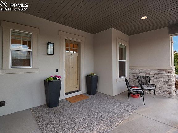 Welcome to this exquisite ranch-style home nestled in a serene setting with captivating views of Pikes Peak. This meticulously crafted residence boasts a harmonious blend of elegance and functionality, offering unparalleled comfort and style. As you step inside, you are greeted by a grand foyer and an inviting entry shaker door, leading to an expansive great room adorned with soaring 12-foot ceilings and abundant natural light. The open-concept layout seamlessly connects the gourmet kitchen, featuring a beverage fridge with coffee bar, with the dining area, perfect for entertaining guests or enjoying intimate family dinners. The main level is highlighted by a luxurious master suite, complete with a spa-like bathroom featuring a free-standing tub and large shower, providing a tranquil retreat for relaxation. Additionally, a private suite on the main level with its own bathroom offers versatility for guests or multigenerational living. 8' interior doors, built in speakers. Downstairs, the open lower level presents endless possibilities, rough-ins for a future wet bar, fireplace, and junior suite. There are two bedrooms with walk-in closets and a large bathroom with double sinks. Outside, the entertainment continues with a covered deck equipped with a gas stub for BBQ, a concrete patio ideal for sports or soaking up the sun, and a cozy fire pit area. The custom xeriscaped landscaping ensures low maintenance, while private fencing along two sides of the property provides peace and seclusion all while backing to walking trails. The location is excellent! Near shopping, schools, restaurants, parks. 60 min to Denver. The amenities in Cordera are Fantastic with the Rec center, Pools and Concerts. This home combines luxury living with practicality, creating an unparalleled living experience. Don't miss the opportunity to make this stunning residence your own and indulge in the epitome of Colorado living. Schedule your private tour today!