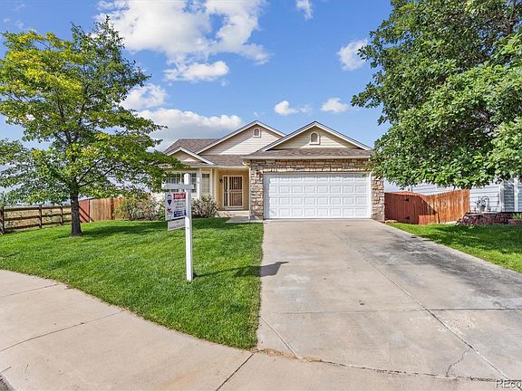 Welcome to this beautifully maintained ranch-style home with STUNNING VIEWS in the highly sought-after Eagle Valley subdivision! Nestled on a prime end-lot in a peaceful cul-de-sac siding to open space and backing to private property. This home boasts wide open mountain views with loads of privacy. The spacious fully fenced-in backyard is perfect for entertaining, kids and dogs. Side yard offer convenient dog run. Inside, enjoy the ease of main-level living with an open floor plan. Main floor primary bedroom as well as main level laundry. The living room features vaulted ceilings, flowing seamlessly into a formal dining area. The kitchen is equipped with tiled surfaces, all appliances included, eating space in the kitchen, and a cozy family room with a gas fireplace. Step out through the rear door to your private backyard oasis, complete with a patio, garden area, and storage shed. 3 bedrooms OR 2 bedroom and a den/study, you choose! Primary bedroom has large ensuite bathroom, walk in closet, double vanity and shower enclosure conveniently located on the main level. Hall bath is a full bathroom with tub/shower to keep your guests comfortable. The main level is rounded out with a laundry room with direct access to the traditional attached two-car garage and long driveway. Ample extra parking in the cul-de-sac. The fully finished basement with egress windows, ample finished and unfinished storage offers endless potential for a home theater, gym, or additional living space. Don't miss the great workshop area and storage room. With easy access to I-25, commuting to Denver or Fort Collins is a breeze. Plus, enjoy the nearby walking and biking trails, open spaces, and everything else that makes this home an ideal retreat.