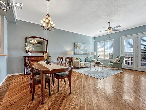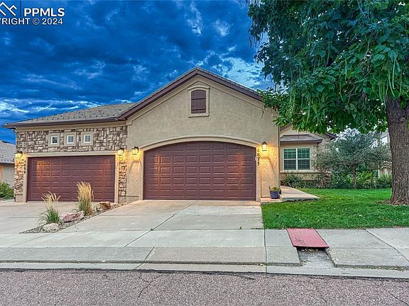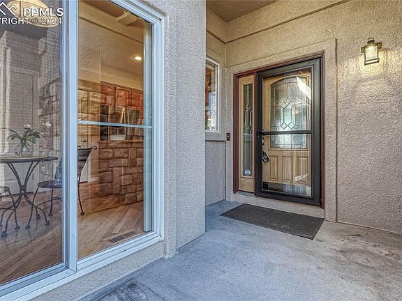 This impressive and well cared for ranch floor plan shows pride of ownership! Excellent Location, D12 Schools, and Upgraded throughout! Bright and spacious floor plan with 4 BRs, 3 Baths offering true main level living. Central Air, Attached 2-car garage, Finished, Walk-out Basement, and Main Level Laundry. Abundant hardwood flooring through the main level. The Great Rm has a gas fireplace, vaulted ceilings, and provides a walk-out to the serene composite deck offering city views and perfect for relaxation after a long day. Spacious kitchen with breakfast nook features a tile counters and backsplash, cabinetry with roll-out shelving, pantry, recessed lighting, and a pass through to the dining room. Stainless steel appliances include a newer electric double oven range, overhead microwave, newer fridge, and dishwasher. Accommodating primary bedroom with French doors, stunning marble flooring, plentiful windows, plantation blinds, adjoining 5-piece bath, vaulted ceiling, and walk-out to the back deck! Primary bath with walk-in closet, glass block window, jetted tub, stand-alone shower, double sink vanity, and medicine cabinet. On the opposite side of the main level, you will find a secondary bedroom/office and a full bath. Finished walk-out basement with gas fireplace, wet bar, two additional bedrooms, full bath, and storage room! Lower-level patio surrounded with mature landscaping! Additional features include a new water heater, new roof, newer furnace and A/C, humidifier, Larson storm doors, abundant storage, walk-in closet in each bedroom, vaulted ceilings, crown molding, two gas fireplaces, plantation shutters, ceiling fans, and window well cover. MINUTES from Fort Carson Army Base, NORAD/Cheyenne Mountain Space Force Station, I-25, shopping center, Safeway, Black Bear Coffee, and restaurants. Conveniently located near hiking trails and North Cheyenne Cañon, Cheyenne Mountain Zoo, the Country Club, Cheyenne Mountain Resort, and the Broadmoor Resort!