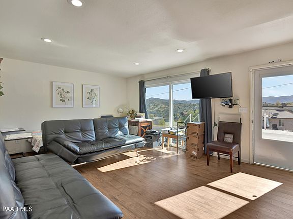 Single Level Ranch Style home w/newer roof. Central Location between Prescott and Prescott Valley, Arizona -close to stores and amenities. Front Concrete Driveway with lots of off street parking, easy to maintain .16 acre lot with paved access, 1 car garage- converted into storage space (easily to convert back to garage if needed). Privacy Fenced Back Yard with Outdoor Living Space/ Patio & additional unfenced back yard space for anything you can dream up! 3 bedrooms, 2 bathrooms with walk in showers, lots of closet space/storage and laundry room. No Carpet Anywhere. Everything is Electric. No Natural Gas. All Appliances Stay. Wheel Chair Ramp Access. Beautiful Natural Light in Living Room with new front Window/Slider Door