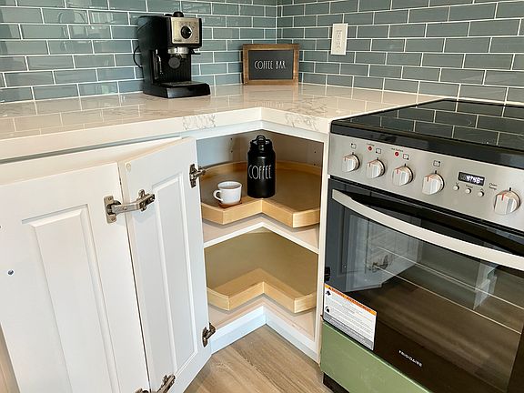 Every detail has been considered from slow-closing cabinets and a built-in lazy Susan to dimmer switches and a stunning backlit bathroom mirror that gives the space a spa-like feel.