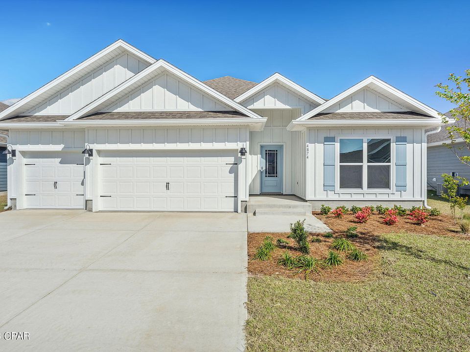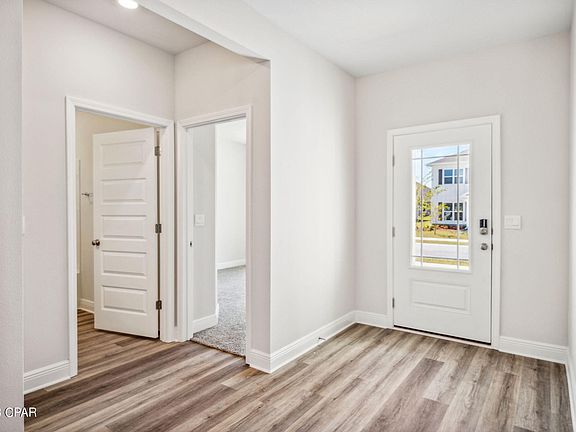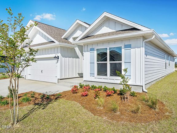 The Destin is a single story detached home that is in the highly desirable community of Titus Park. Located on the north east side of Panama City, Titus Park is a short drive to downtown Panama City, the Gulf of Mexico with sugar sand beaches, Tyndall Air Force Base, shopping, dining, and more! The home has a private entrance with concrete pathway, steps, and designer landscaping. Inside, you are warmly greeted by engineered vinyl plank floors that lead to a bright and open floor plan seamlessly connecting the kitchen to the living room and leading to the inviting, sunny backyard that backs up to a common area. Meticulous attention to detail is presented in the kitchen with granite countertops, white cabinetry with brushed nickel knobs, and stainless steel Whirlpool appliances which includes the following: stove, dishwasher, and microwave. A 10' tray ceiling with beautiful crown molding gives the living area have a very open feel. The 1st bedroom is located directly off of the living area and also features a tray ceiling with crown molding, and a bathroom featuring a double vanity, large shower, full size soaking tub, and a walk in closet. There are 3 additional bedrooms located adjacent to 2 other full bathrooms. The back patio is a wonderful entertainment space for family and friends. There is more than ample storage available in the 3 car garage. New homes in Titus Park also feature a smart home system that includes a KiwkSet Keyless Entry, Skybell doorbell, automated front porch lighting, an Echo Dot, and a Qolsys touch pad, and customizable LED lighting. For more information, call model office at (850) 775-2027. Our model home is open Monday through Saturday 10-5PM and Sunday 1-5PM.