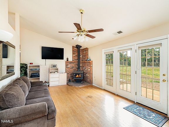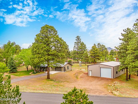 A rare find in this charming pocket neighborhood in Timberline! Just a stone's throw from the forest, this meticulously maintained, turn-key 3-bedroom, 2-bath home is ready for you. The spacious great room features a wood-burning stove and easy access to the back patio and yard. The primary suite offers a private bath and closet, with two additional bedrooms nearby. The property includes an attached 2-car garage plus a massive 35 x 45 RV garage/shop capable of housing the biggest toys or business ventures, with room for 6-8 more vehicles. Additional outbuildings include a quad or tractor garage, open storage, and a playhouse. Enjoy the serenity of being minutes from Flagstaff, close to the national forest, and with all utilities available. Don't miss this exceptional opportunity!
