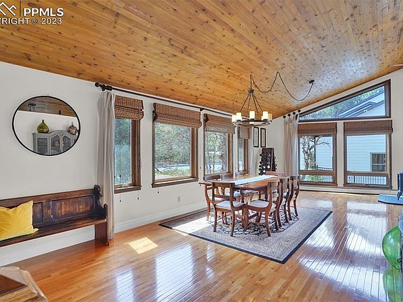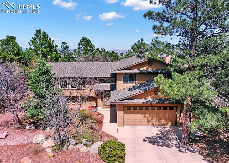 Stunning home nestled among the pine trees in Broadmoor Bluffs offering Cheyenne Mountain views. With 4 BR, 3 BA & nearly 3,400 SF this home is the ideal blend of formal and casual living space – great for entertaining with comfortable livability. The open foyer leads you to the sun filled great room featuring extensive hardwood flooring, wood plank ceilings, and wood stove. The kitchen boasts abundant counter and cabinet space, granite counters, center island, gas range and adjoining nook. The elegantly appointed dining room offers large windows that overlook the foothill setting. The spacious master retreat provides an adjoining remodeled bathroom and walk-in closet. Two secondary bedrooms and a full bathroom complete the upper level. The lower level features a sprawling family room with a cozy gas fireplace. The basement opens to a flex room – ideal for exercise, office, music room or gaming space. There is a spacious bedroom and bathroom in the basement. Enjoy relaxing on nearly 900 square ft of al fresco living on the composite decks surrounded by ponderosa pines, scrub oak, wildlife and the charm of foothill living. Conveniently located just minutes to Hwy 115, and I-25, with easy access to shopping, dining, and Fort Carson. Walk to Cheyenne Mountain Elementary School and Oak Meadows Park. Surrounded by natural splendors with views, wildlife and privacy, this home reminds you of why you love to live in Colorado.