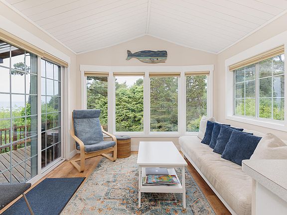Ocean view: Fully updated park model with a bright, clean, inviting interior. Vaulted ceilings with shiplap for an expansive and easy beachy feel; offered fully-furnished. Natural light throughout with newer large picture windows. Private from road, this getaway opens-up to a large deck in a forested setting, with whitewater views of the ocean.