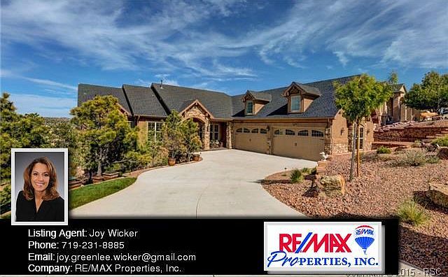 STUNNING CUSTOM HOME in University Park-surrounded by open space! Completed Dec-2011, this ranch home is open & elegant w/all custom features expected including-Gourmet Kitchen w/Alder cabinets, slab granite counters, great room w/stone walled fireplace, large deck & custom grill area-Room to relax or entertain! Master retreat features a sitting area & two-sided fireplace. The master bath includes a roman walk-in shower, soaking tub, separate vanities & granite counters. Study w/French doors & Lndry on main. 4+ CAR GARAGE! WOW! OVERSIZED 4 CAR GARAGE w/WORKSHOP - THE PERFECT MAN CAVE! The basement is the perfect place for family and friends, or just relaxing-including a recroom with gas fireplace & custom shelving, beautiful wet bar with granite counters, 3 large bedrooms with walk-in closets, two baths, wine room (ready for racks and great wine - currently being used as a small piano room), large unfinished storage area (could finish to be a 5th bedroom or workout room), and walk-out to another spacious patio area. Surrounded by mature trees and scrub oak - lots of privacy! There is a private community park across the street, another park at the end of the street, as well as hundreds of acres of wooded open space and miles of trails adjoining the community. Enjoy the feel of the mountains w/the convenience of being in the heart of town. WELCOME HOME! Listing Agent: Joy Elizabeth Company: RE/MAX Properties, Inc. Phone: 719-231-8885 Email: joy.greenlee.wicker@gmail.com
