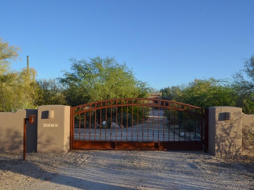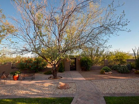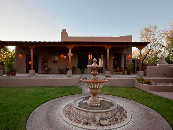 Beautiful, relaxing, private custom Santa Fe on fenced 3.3 acres. Electronically gated front entry to property. Great room concept -very open with privacy and views. Oasis style backyard. Large workshop/garage (24 x 42) with electric & it's own evaporate cooler + separate garden shed. Private well. Fine details throughout home.Property boasts 30 trees in addition to nature lush desert landscape. Very spacious backyard has tumbled paver stones. Gas Kiva fireplace BBQ area near kitchen. Custom built on post-tension slab. Office/den has custom built-ins. All bedrooms have walk-in closets. Kitchen has all stainless steel appliances that do convey. Other highlights include full length rear patio w/metal roof, RV parking areas, electric & gas behind both stove & dryer, owned security system.