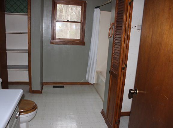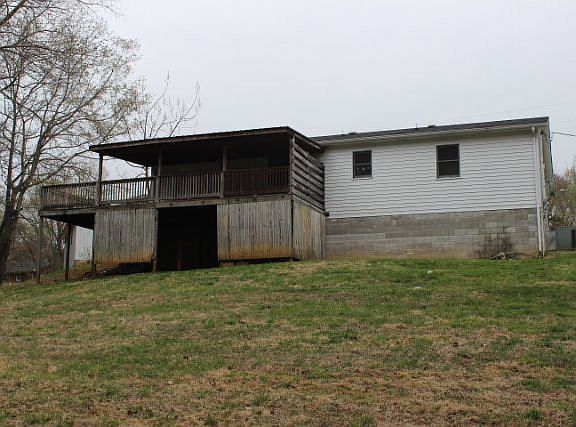 Home with detached garage and a large crawl space with shelving and a light for storage.