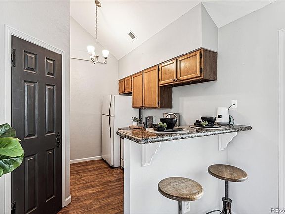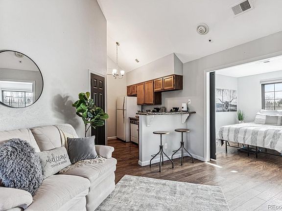 This property is your opportunity to blend homeownership in an affordable community with access to all the amenities and attractions that Glendale has to offer. Whether you are a first time buyer or looking to downsize, this chance allows you low maintenance living in a vibrant neighborhood without breaking the bank on HOA fees. This updated, 1 bedroom, 1 bathroom condo boasts soaring vaulted ceilings that create a sense of openness and space. As you enter you are greeted by a cozy fireplace. The bedroom offers a peaceful retreat with a serene view of the park, inviting in natural light and providing a tranquil backdrop for relaxation. Outside a private balcony beckons you to step out and savor your morning coffee or evening glass of wine while taking in the trees. Updates enhance the appeal of this home with its new modern black framed windows, sliding barn door to the bedroom, newer paint throughout, a new washer and dryer, beautiful granite kitchen countertops, an updated bathroom, and LVP flooring throughout. Glendale offers shopping, coffee shops and dining options as well as easy access to major highways and Denver amenities. The Cedar Point Complex offers a low HOA, plenty of open space parking and is just steps from Infinity Park and the serene Cherry Creek Trail.