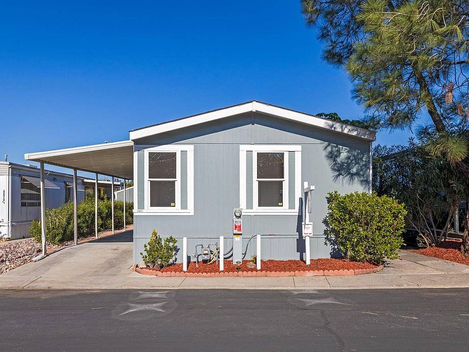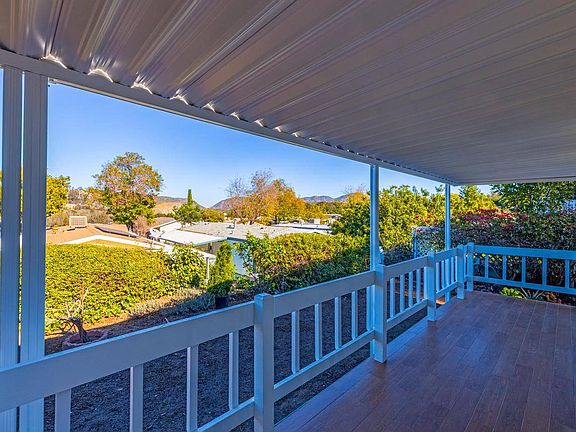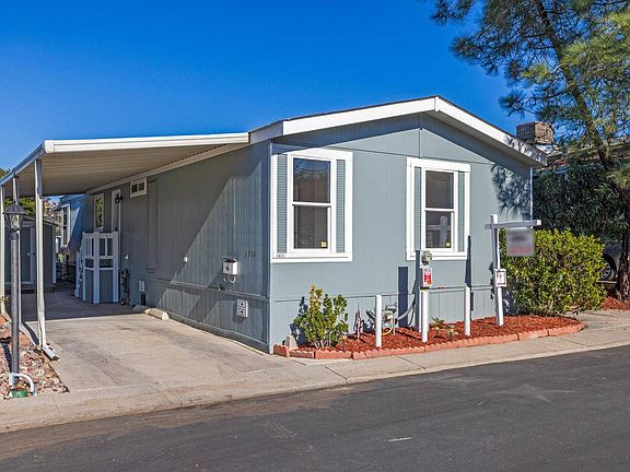 Remodeled and Move in Ready, 3 BR / 2BA, Paid For Solar, and Views! The Cliffs, 55+ Senior Mobile Home Park, is just minutes from Admiral Baker Golf Course & Mission Trails Regional Park. This 2003 manufactured home exterior features paid for solar panels, shingle roof, hardi-panel fiber cement siding, new hot water heater, and a 8x10 tuff shed. Termite fumigation is still under warranty. The sound of the breeze whispering through the tall pine tree is relaxing, a wide walkway and flowering plants welcome you to the entrance and the newly tiled covered deck. Enjoy north facing views and city lights from the yard, deck, or living room. Interior features a vaulted ceiling, ample windows, new dual glazed vinyl sliding glass door, new luxury vinyl plank flooring throughout, fresh paint, and new whole house air conditioner. The kitchen has plenty of storage cabinets, including pantry, new stainless-steel appliances, and gleaming quartz counters. A full-size washer and dryer are in the separate laundry. Bedrooms are of ample size with primary bedroom having a walk-in closet, soaking tub and shower combo. Over 1,120 square feet conveniently located next to the clubhouse, library, heated pool and hot tub.