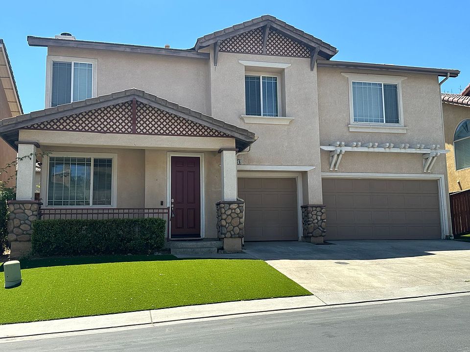 Make this 2 story very spacious 4 bedrooms 3 bathrooms with a loft hardwood flooring through out. Downstairs you will find 2 spacious family rooms 1 with a fireplace leading to a very open kitchen and bathroom. Upstairs is the master bedroom, loft, additional rooms and laundry room with washer/dryer connections. The back and front yard have synthetic grass, leaving very low landscaping maintenance. There is a 3 car garage, community pool, and gated community.