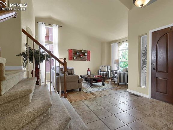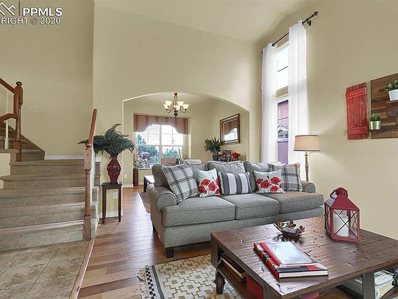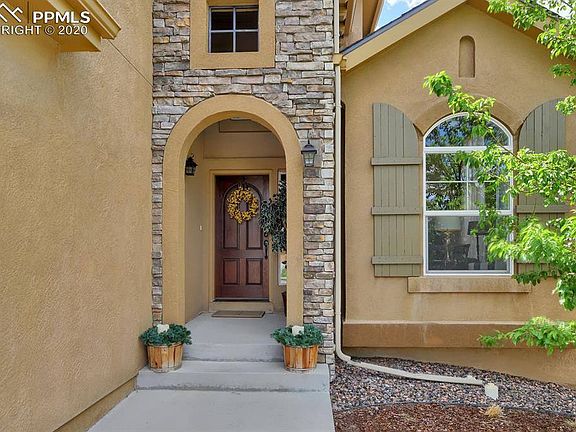 Former Model w/high end Finishes and Upgrades~One Block to Community Center~Stunning Stucco & Stone D20 Home in Popular Cordera Neighborhood~Pikes Peak and Front Range Views~Tiled 2-Story Entry~Formal LR/DR~French Doors into ML Office~Great Rm w/Stone Gas FP~Gourmet Island Kitchen w/Granite~Walk-Out to Covered View Deck~SS Appl~ML Laundry~Vaulted MBR w/Pedestal FP into Sitting Area~Spa 5pc Bath~2 more BRs + Full Bath Up~9ft Walk Out Bsmt w/Rec Rm & Wet Bar, 2 BRs & Full Bath~Fenced Lot~Walk to Park, Comm. Ctr, Schools.