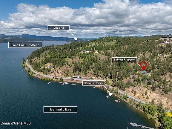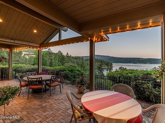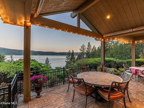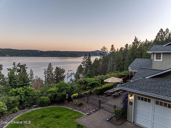 Experience lakeside living at its finest with this stunning 3,592 SF home featuring 4 bedrooms and 3.5 bathrooms on 2.88 private acres with 53 feet of pristine Coeur d'Alene lake frontage and your own private dock. The beautifully designed kitchen boasts a large island and walk-in pantry, ideal for entertaining. Enjoy oak wood floors, a cozy gas fireplace, and a spacious master suite with serene views. Step outside to a fully fenced yard with a sprinkler system, hot tub overlooking the lake, and an outdoor fireplace perfect for year-round enjoyment. Take in the breathtaking scenery from the open patio or retreat to the impressive 30x30 shop complete with a full kitchenette and bathroom. Located just minutes from downtown Coeur d'Alene and Tony's Restaurant. A view easement ensures your panoramic lake vistas are protected for years to come. This is the North Idaho dream — luxury, privacy, and nature combined.