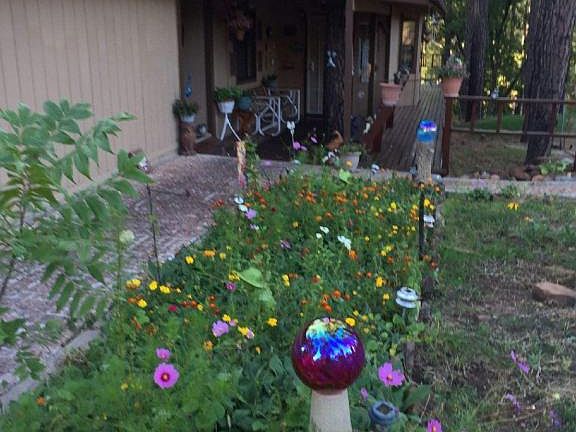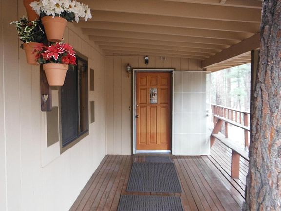 Large lot with tall mature Pines. Home has 3 bed, 2 bath, small office area, inside laundry room, two car garage with a separate lighted car port. Wrap around deck to enjoy the views, wildlife and fresh mountain air. Also includes outside picnic table on the patio, fountain feature, 12x16 shed and 2 more sheds, firewood. Great open floor plan. Inside features foyer, great room, large kitchen, office nook, split floor plan, large master with wood stove, large walk-in closet. tiled walk in shower. Great property, come see for your self.