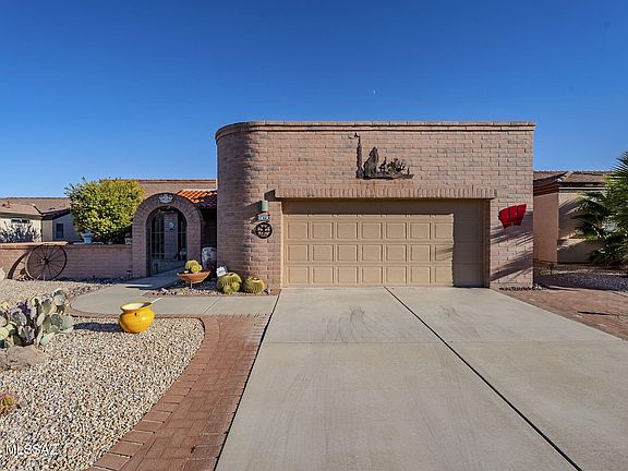 Nestled in the serene San Ignacio Vistas neighborhood of Green Valley, this stunning 2-bedroom, 2-bathroom brick home offers breathtaking, unobstructed views of the majestic Santa Rita Mountains. An enclosed front courtyard welcomes you to this meticulously maintained property, complete with tile flooring throughout and an inviting open layout. The home features an oversized 2-car garage, thoughtfully designed with built-in cabinets, a workbench, and an extended driveway for additional parking. Inside, the spacious kitchen boasts modern stainless steel appliances, a cozy breakfast nook, and a convenient breakfast bar, perfect for casual dining. The laundry room is equipped with cabinets, a utility sink, and ample space for organization. An additional office/den and a dedicated storage room with standing cabinets provide plenty of functionality for a variety of needs. The backyard is an entertainer's delight, featuring a newly constructed gas fire pit, a soothing water feature, and a remote-controlled roll-down screen on the patio for added comfort.