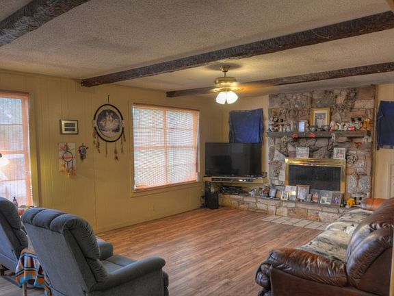 Priced Reduced and SELLER MOTIVATED! Live the country lifestyle-Unique fixer upper 3/2 home with gorgeous hilltop views! Property is to be sold "AS IS". Land is unrestricted and all usable land! Enjoy hunting privileges and/or keep your livestock and horses within this all fenced and gated property. Home needs TLC but features large living room with fireplace, open kitchen combo w/ newer cabinetry. Originally a single wide mobile home, house has evolved into solid real property-hardiplank exterior w/ wood frame construction, slab underneath room additions, much storage throughout! Attached fenced in area with outdoor grill, TWO garages, one detached 2 car garage and another detached 2 car garage with loft. Private well (new pump installed recently) and licensed septic. No city taxes!