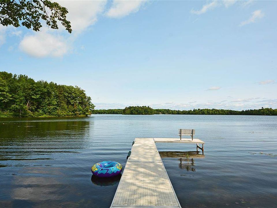 150??? of private Bass Lake frontage. Views of the lake from almost every room of this bright and open 2BD/1.75BA home with furnishings; vaulted ceiling; gas fireplace; ceramic & marble-tile flooring; island kitchen; private master suite; 2-car attached garage; large deck overlooking the lake and sandy beach; expansive yard; 50' aluminum dock & more. Situated in a quiet cove on this all-sports, 89-acre lake that offers fine fishing, swimming and boating. Close to the amenities of Traverse City &