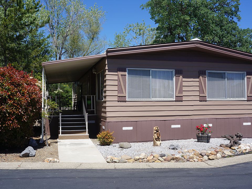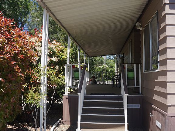 ''Redding's 5 Star Senior Mobile Home Park.'' Totally renovated and move in ready. Located on a quiet street with trees on a spacious lot backed by a flowing creek and walking path. Great open floor plan perfect for your comfort, and for entertaining family and friends. This spacious 1340 square foot home features 2 bedrooms, 2 bathrooms and a separate laundry room with a great washer and dryer. The bright kitchen has brand new quality cabinets, double sink, new countertops and dishwasher. Stove and frig are like new. The kitchen opens onto a spacious dining room, which opens onto the covered porch. Nice new flooring in the dining room, kitchen, gathering area and hallway. Brand new carpet in the living room, office and bedrooms. Huge closet space throughout. Large shed. Beautiful bathrooms - one all new. The space rent includes water, sewer and trash. Amenities include a large lending library and meeting room with kitchen, heated swimming pool, dressing rooms and sauna. Small pets are allowed. It's near a shopping center.