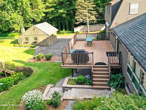 Welcome to your own park-like setting located on a gorgeous level parcel, with 2 lots conveying, totaling 1.20 acres. 4 bedroom 3 bath colonial w potential for 5th bedroom in walk-out lower level. Completely remodeled kitchen w abundant high-end cherry cabinetry and Corian counters, featuring top of the line SS appliances, open to a warm and inviting breakfast area, brick fireplace and access to a newly remodeled 30x16 Trex deck. 1st floor also offers a formal living room (potential office, formal dining room, and first floor bedroom w nearby full bath. The Family room, added in 1990, perfect for media and great entertaining with high ceilings, lots of windows, storage space and wood floors. 2nd floor features 3 large bedrooms and one full bath, including a front-to-back primary bedroom with 3 closets, (one is a walk-in and could be turned into full bath. The walk-out lower level adds about 1100 sq.ft of living area, and is divided into several areas: rec-room w/FP, potential 5th bedroom with windows and nearby full bath, separate office area, laundry room & access to 16x30 covered patio. Additionally, this home is surrounded by glorious color all seasons, full of low-maintenance perennials, unique and rare flowering trees, blueberry bushes, new front-to-back walkway, 2-car detached garage w/attic access. Home re-sided in 2020, New AC 2021, 3 zone heating/cooling, new 50yr roof in 2010, red-oak wood floors, new carpeting. Too much to list, have to see it all.